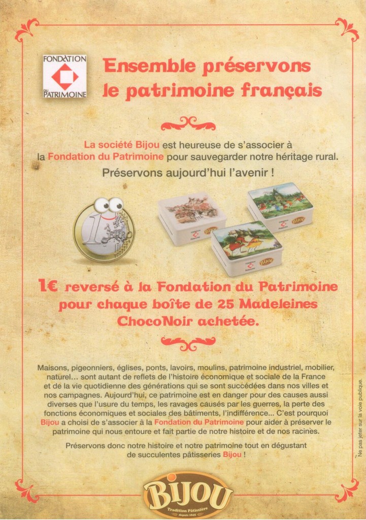 Si vous achetez une superbe boite collector de 25 madeleines Bijou au ChocoNoir à 20 €, vous permettez à la Fondation du Patrimoine de gagner 1 €, pour la sauvegarde du patrimoine national et à la chapelle St Jean-Baptiste de récupérer pour sa restauration 13,10€.