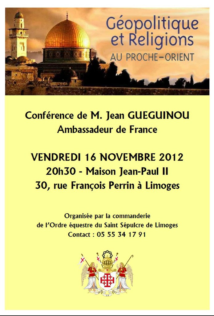 12 novembre 2012Vendredi 16 novembre à 20h30 maison Jean-Paul II, M. Jean GUEGUINOU, ambassadeur de France donnera une conférence sur "Géopolitique et religions au Proche-Orient". Alors que la Syrie est toujours à feu et à sang, qu'à Gaza les violences repartent de plus belles entre le Hamas et Israël, que l'Egypte reste fragile, que les chrétiens quittent leur pays, nous pourrons ensemble essayer de comprendre les tenants et aboutissants de la situation au Proche-Orient.