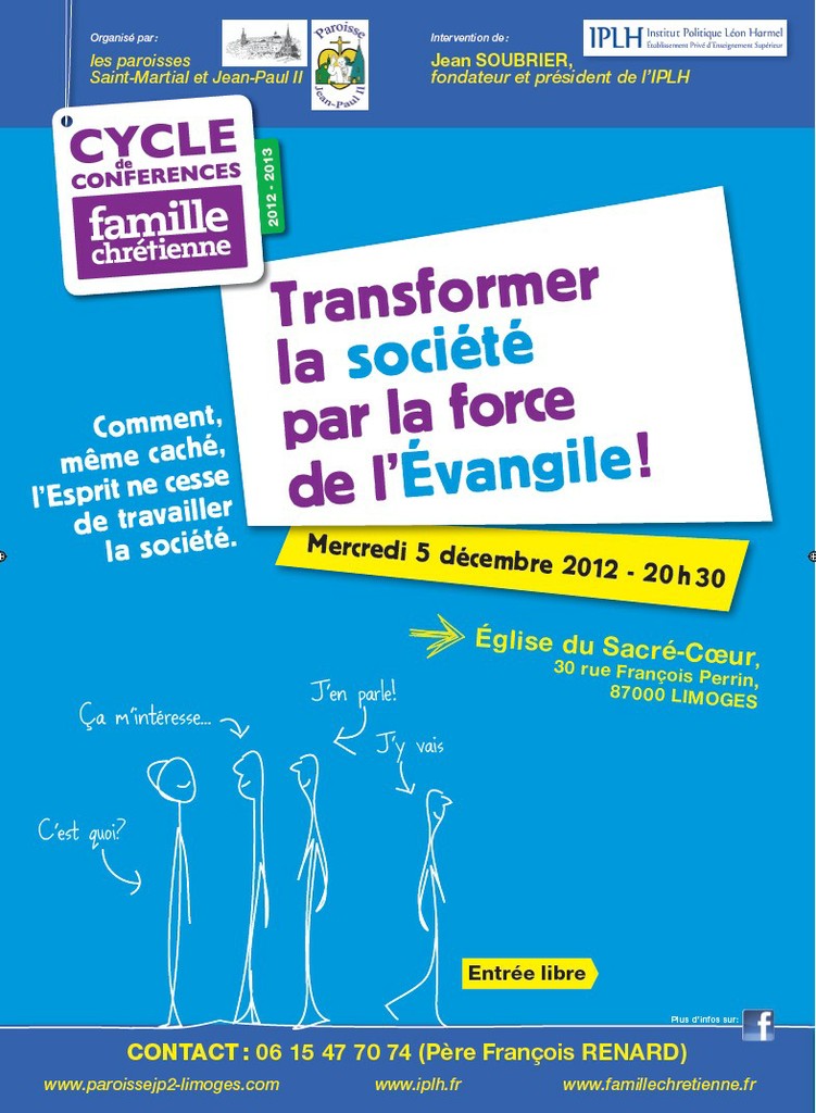 20 novembre 2012En lien avec la paroisse St Martial, nous organisons un cycle de trois conférences dont la première aura lieu le mercredi 5 décembre prochain à l’église du Sacré Coeur. Une manière de vivre l'année de la Foi... Voici les thèmes et les dates des suivantes : Mercredi 5 décembre 2012 : « Transformer la société par la force de l’Évangile » Jean Soubrier, directeur de l'Institut Politique Léon Harmel Mercredi 16 janvier 2013 : « Peur de l’engagement : que fuyons-nous ? » Yves Meaudre, directeur de « Enfants du Mékong » Jeudi 21 mars 2013 : « Lorsque la fragilité nous invite à la fraternité » Laurent de Cherisey, fondateur et directeur de l’Association « Simon de Cyrène »