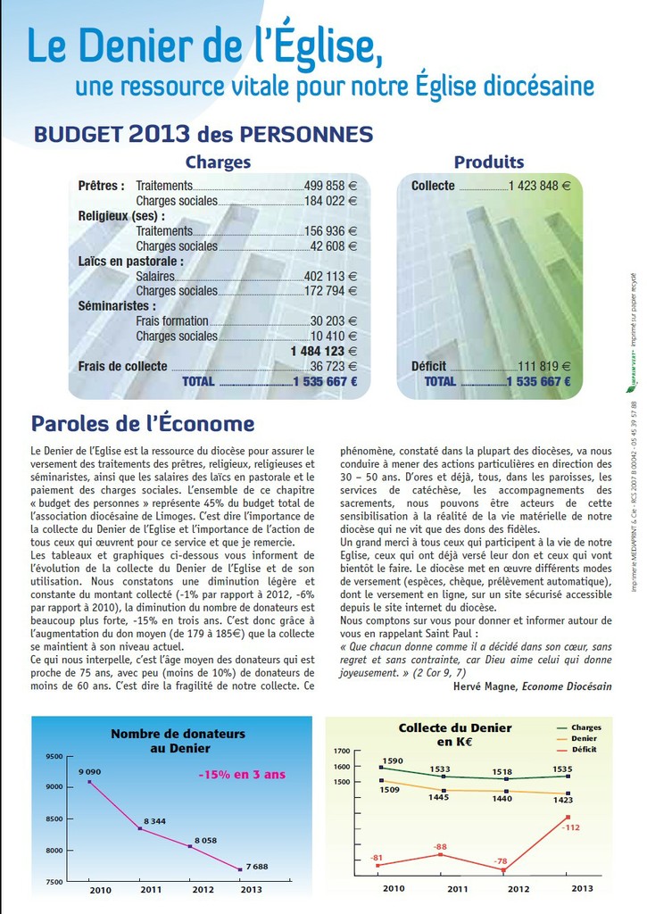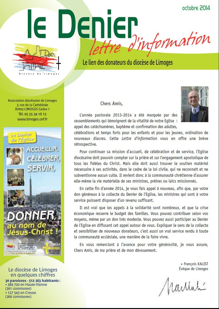 27 octobre 2014Pour continuer sa mission d’accueil, de célébration et de service, l’Eglise diocésaine doit pouvoir compter sur la prière et sur l’engagement apostolique de tous les fidèles du Christ. Mais elle doit aussi trouver le soutien matériel nécessaire à ses activités, dans le cadre de la loi civile, qui ne reconnaît et ne subventionne aucun culte. Il revient donc à la communauté chrétienne d’assurer elle-même la vie matérielle de ses ministres, prêtres ou laïcs missionnés. En cette fin d’année 2014, je vous fais appel à nouveau, afin que, par votre don généreux à la collecte du Denier de l’Eglise, les ministres qui sont à votre service puissent disposer d’un revenu suffisant. Il est vrai que les appels à la solidarité sont nombreux, et que la crise économique resserre le budget des familles. Vous pouvez contribuer selon vos moyens, même par un don très modeste. Vous pouvez aussi participer au Denier de l’Eglise en diffusant cet appel autour de vous. Expliquer le sens de la collecte et sensibiliser de nouveaux donateurs, c’est aussi un vrai service rendu à toute la communauté ecclésiale, une manière de la faire vivre. En vous remerciant à l’avance pour votre générosité, je vous assure, Chers Amis, de ma prière et de mon dévouement. + François KALIST Évêque de Limoges