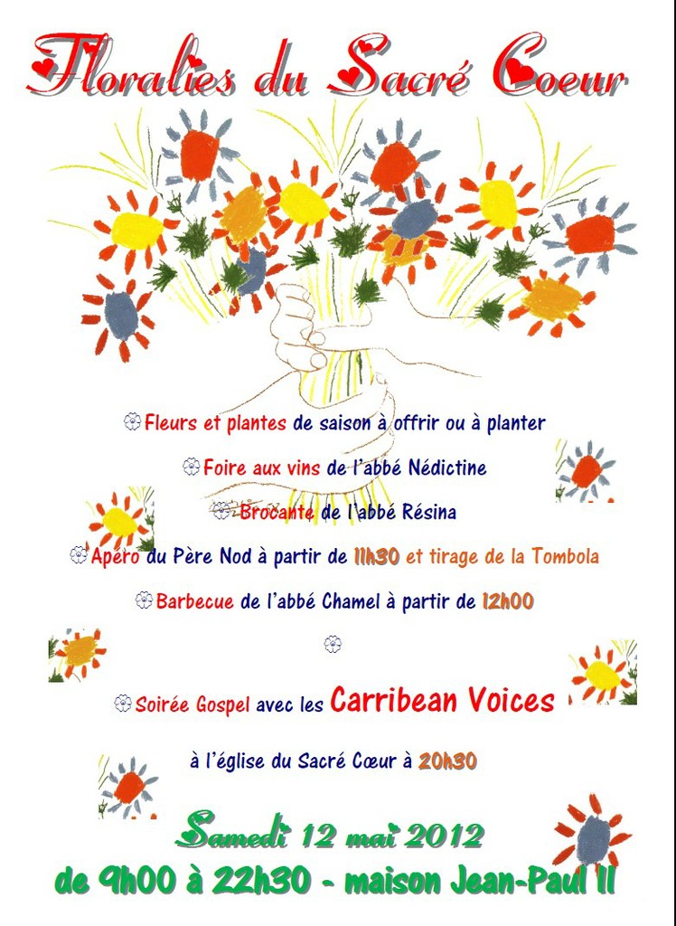 16 avril 2012A noter dans vos agendas dès à présent : SAMEDI 12 MAI 2012 de 9h00 à 22h30, Floralies du Sacré Coeur. Une journée paroissiale pour vivre ensemble un bon moment.