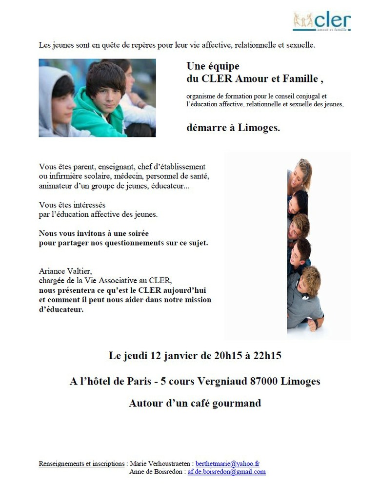 9 janvier 2012Création d'une équipe CLER sur Limoges en vue de promouvoir l'éducation affective dans les écoles, collèges et lycées. Pour mieux connaître le CLER aujourd’hui, et répondre au mieux à votre questionnement, nous vous invitons pour une soirée de rencontre. Elle se tiendra autour d’un café gourmand le jeudi 12 janvier à 20h15 à l’hôtel de Paris.