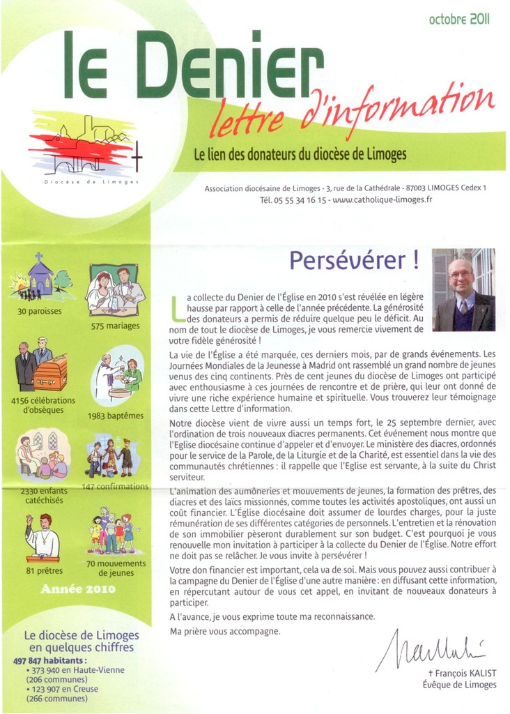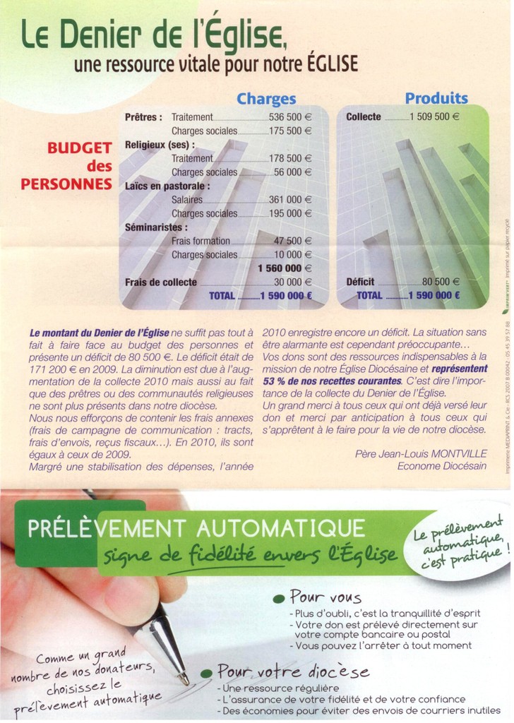 31 octobre 2011Le denier de l’Église est la ressource principale du diocèse. Il permet d'assurer le traitement des prêtres en activité et le salaire des laïcs chargés de missions ecclésiales. C'est grâce à votre générosité que la mission peut se poursuivre. MERCI.