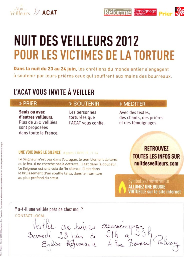 25 mai 2012Dans la nuit du 23 au 24 juin, les chrétiens du monde entier s'engagent à soutenir par leurs prières ceux qui souffrent aux mains des bourreaux. L'ACAT vous invite à veiller...