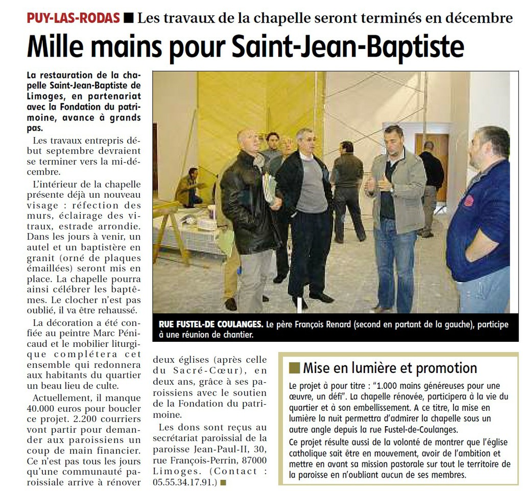 21 novembre 2011Un bel article dans le Populaire pour notre chapelle en restauration. A voir ici...