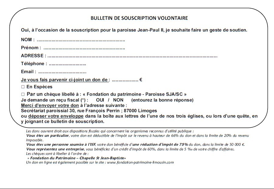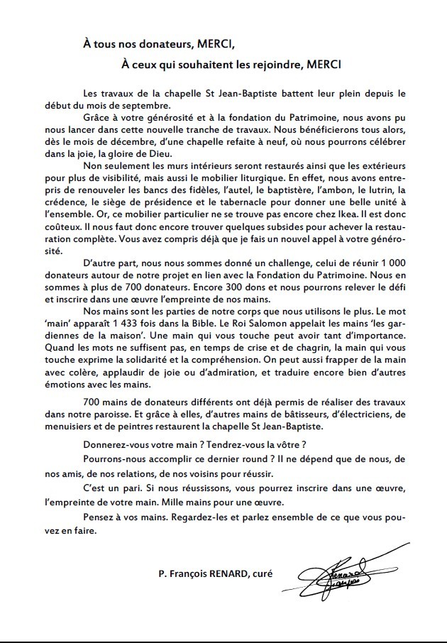 26 septembre 2011Dernière ligne droite pour la chapelle St Jean-Baptiste. Après avoir vendu près de 250 boites de madeleines BIJOU (merci aux gourmands), nous lançons un dernier appel à souscription volontaire pour boucler le budget. MERCI A VOUS TOUS.