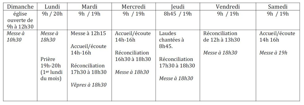 A partir de cette même semaine, un calendrier hebdomadaire est établi. Il offre un rythme de rencontres diverses, que précise le tableau ci-dessous. Il offre, en plus des propositions déjà existantes de la paroisse (en italiques) de nouvelles possibilités d’accueil et d’écoute, de prière et la réconciliation.